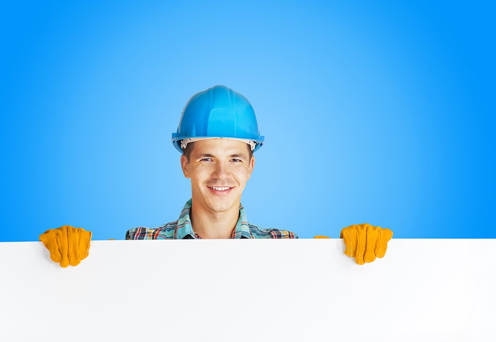 worker with blank board on white isolated